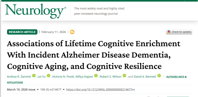 [1]Zammit AR, Yu L, Poole VN, Kapasi A, Wilson RS, Bennett DA. Associations of Lifetime Cognitive Enrichment With Incident Alzheimer Disease Dementia, Cognitive Aging, and Cognitive Resilience. Neurology. 2026 Mar 10;106(5):e214677. doi: 10.1212/WNL.0000000000214677. Epub 2026 Feb 11. PMID: 41671519.