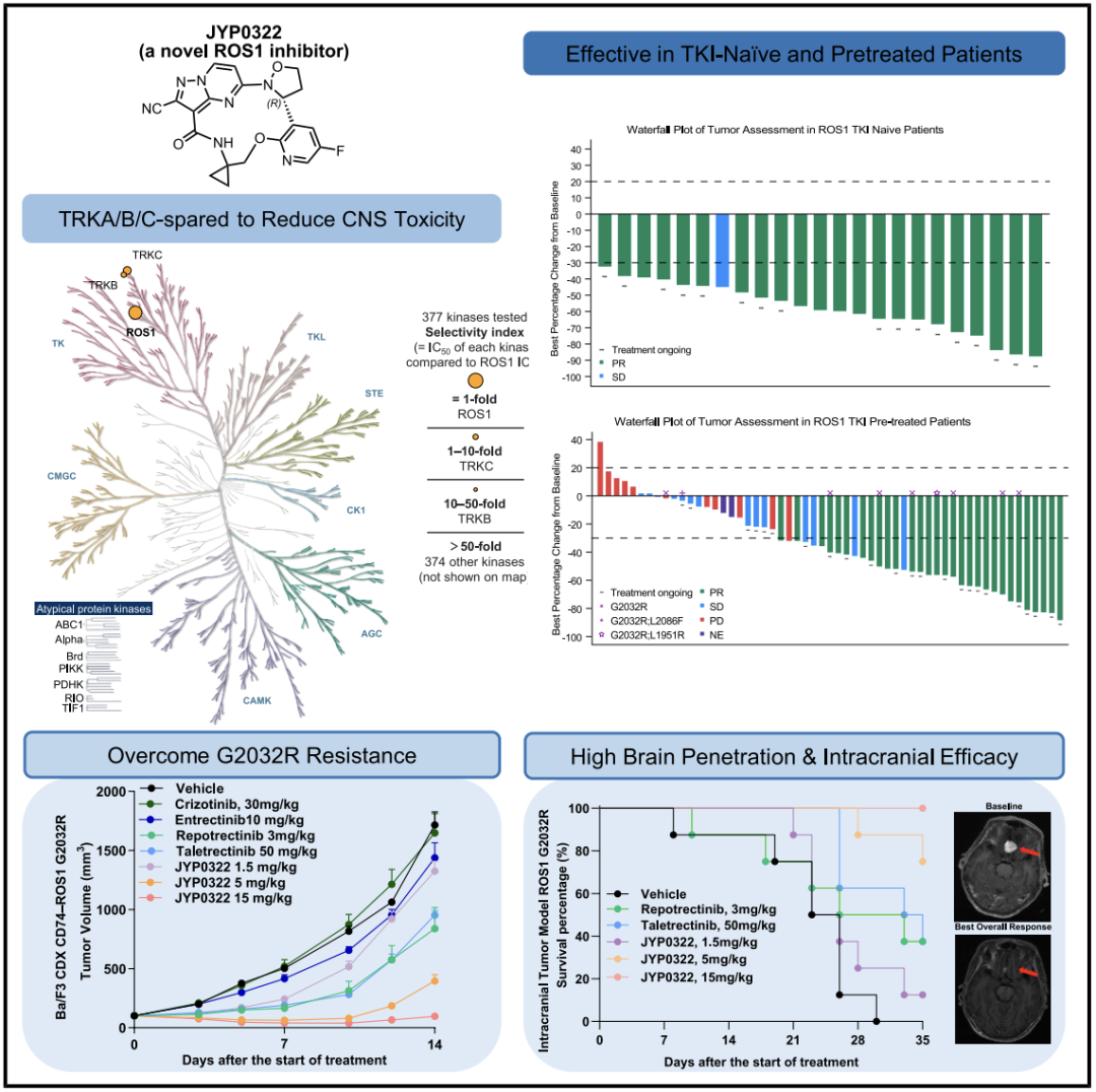 结果显示,JYP0322 在 ROS1 阳性非小细胞肺癌初诊初治以及多药耐药的患者中(包括携带 ROS1G2032R 耐药突变的患者及脑转移患者),均展示了卓越的疗效,同时保持了良好的安全性,中枢神经系统相关毒性发生率显著降低。