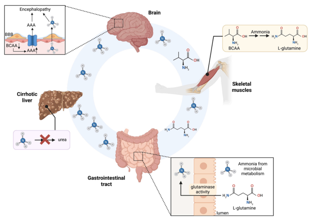 高氨血症是肝性脑病(Hepatic Encephalopathy,HE)的一个标志性特征。肝性脑病是一种因急性或慢性肝衰竭导致氨水平升高、并穿过血脑屏障(BBB)而引发的病症。这会损害大脑葡萄糖代谢,改变脑血流量,并由于 L-谷氨酰胺的积累导致星形胶质细胞体积改变,从而引起严重的神经功能损伤。患者会出现从轻微认知障碍到意识模糊、昏迷等一系列症状。