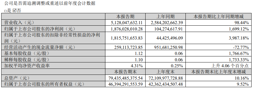 天齐锂业公告,一季度实现营业收入51.28亿元,同比增长98.44%;归属于上市公司股东的净利润18.76亿元,同比增长1699.12%;基本每股收益1.12元,同比增长1766.67%。