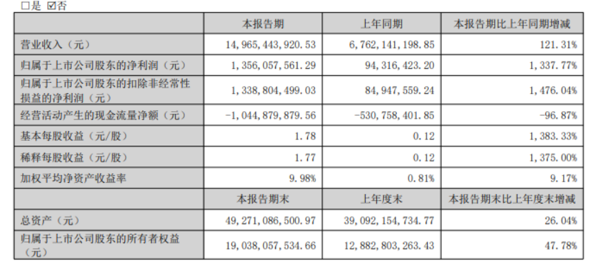 湖南裕能公告,公司2026年一季度实现营业收入149.65亿元,同比增长121.31%;归母净利润13.56亿元,同比增长1337.77%。