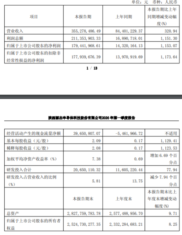 源杰科技公告,2026年第一季度实现营业收入3.55亿元,同比增长320.94%;归属于上市公司股东的净利润为1.79亿元,同比增长1153.07%。