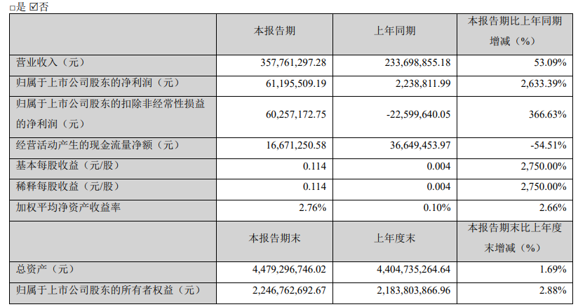 博云新材公告称,2026年第一季度实现营业收入3.80亿元,同比增长125.94%;归属于上市公司股东的净利润为1.32亿元,同比增长13362.43%。