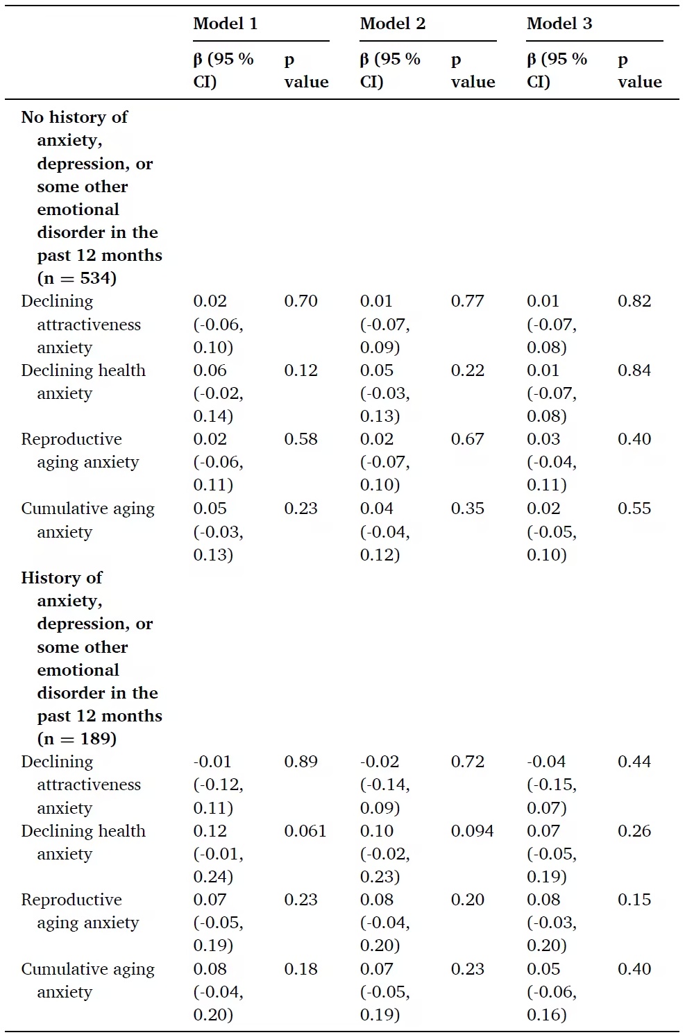 研究按过去12个月内是否有焦虑、抑郁等情绪障碍史进行分层分析。结果显示,在有情绪障碍史的女性中,健康焦虑与DunedinPACE的关联数值上更强,尽管因样本量限制未达到传统