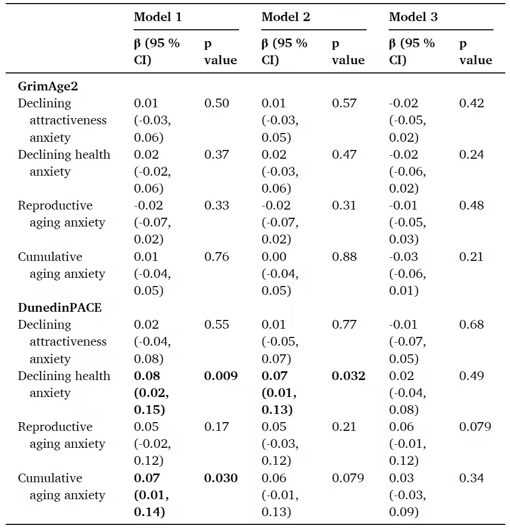 担心外貌变老或无法生育,与两种表观遗传时钟均无显著关联。研究者还将三种焦虑合并为累积得分,结果与DunedinPACE的初步关联在加入慢性病和生活方式因素后同样消失。而GrimAge2这一长期损伤指标,与任何一种焦虑都未显示出有意义的关系。这表明,加速当前衰老速率的不是泛化的怕老,而是对健康下滑的特定恐惧。