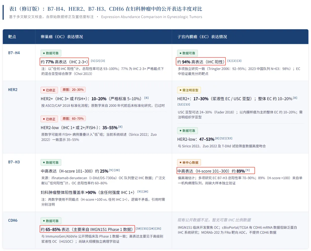 1)在众多的妇科肿瘤热门研发靶点中,B7H4不仅在正常组织表达量极低,同时其在PROC和EC均有较高的表达丰度,相较于CDH6或者B7H3均为其中一项肿瘤表达丰度高,B7H4更像是妇科肿瘤的“专属贵族靶点”;