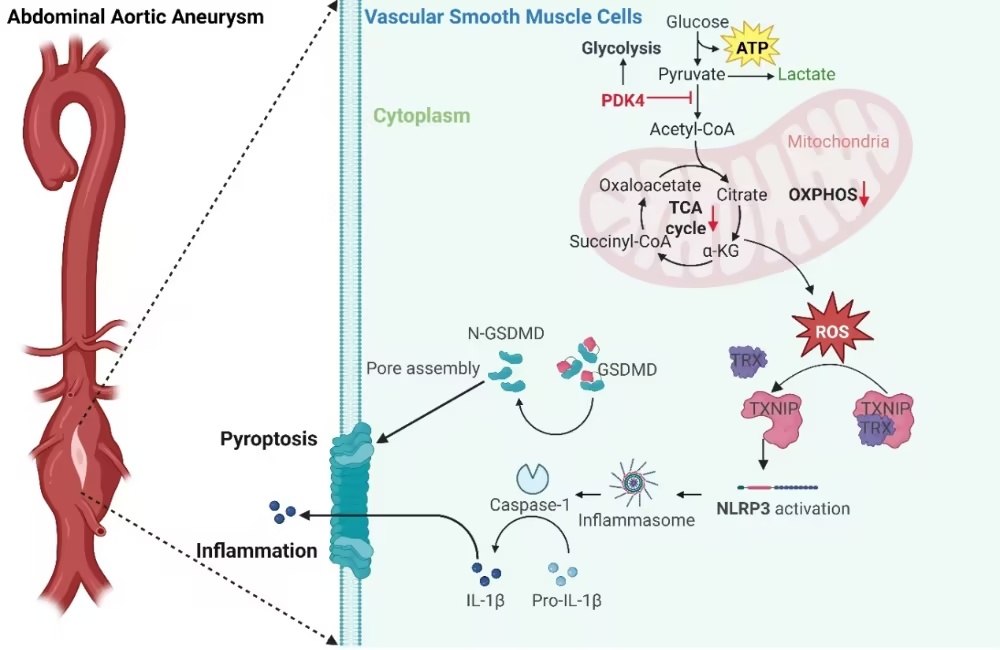 本研究证实,PDK4在腹主动脉瘤中显著升高,通过驱动血管平滑肌细胞代谢重编程、线粒体损伤及NLRP3介导的细胞焦亡,促进腹主动脉瘤发生发展,并提示靶向PDK4/NLRP3轴具有潜在治疗价值。