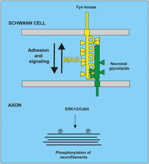 在组织层面,MAG主要分布于大脑和脊髓的白质区髓鞘纤维束,其中胼胝体是一个高度富集的区域;其亚细胞定位非常精确,主要位于髓鞘最内层与轴突直接接触的轴突旁膜,部分位于轴突系膜 (mesaxon)和结旁环 (paranodal loops),即它主要存在于非致密髓鞘 (non-compacted myelin)区域,而致密髓鞘 (compact myelin)则没有MAG的分布。