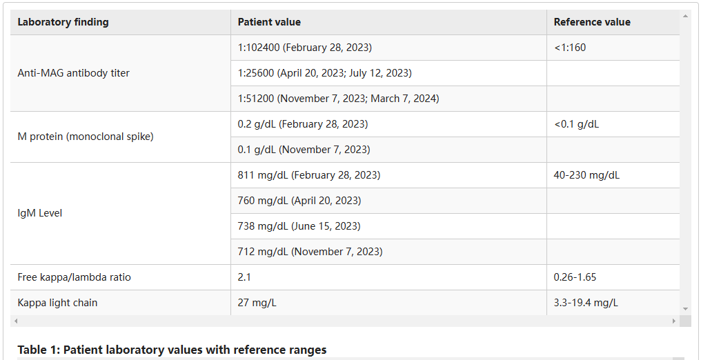 靶向BTK抑制剂:赞布替尼(Zanubritnib)是一种第二代BTK抑制剂,它代表了最新的治疗方向。有临床案例显示赞布替尼能显著降低抗MAG神经病患者抗体的滴度并稳定其症状。此外,一项名为MAZINGA的II期临床试验也正在进行。