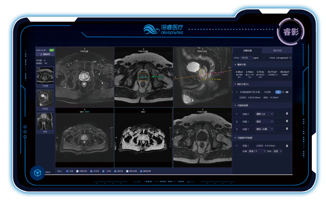 深睿医疗全新发布的前列腺MR AI辅助诊断系统,精准聚焦前列腺疾病诊疗难点,依托多模态影像处理技术及自主研发的核心算法,支持多序列影像智能识别、前列腺腺体自动分割与分区、病灶自动检出与PI-RADS评分,具备结构化报告一键生成功能,串联起前列腺疾病筛查、诊断、分期、随访的全流程。系统可精准快速识别微小病灶、集影像阅片、智能分析、病灶定位与报告生成为一体,大幅提升诊断效率与一致性,不仅为临床医生提供可靠的决策支持,还能助力科研数据规范化管理,推动前列腺疾病诊疗向精准化、标准化转型,构建起前列腺疾病精准诊疗全流程的支撑体系。
