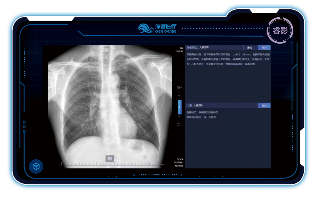 胸片大模型报告中心,深度融合医疗大模型与影像场景,以“医生的思考模式”进行大模型训练,覆盖几十种疾病的胸片诊断需求,实现危急值管理、结构化报告自动生成的全流程智能化,真正做到X光检查全场景覆盖,从根源上满足胸部疾病筛查与诊断的临床刚需。胸片检查是基层影像诊断的首选方式,深睿胸片大模型报告中心的上市,助力基层机构大幅提升阅片效率与诊断精度,促进优质医疗资源下沉,让同质化医疗服务惠及更多基层群众。