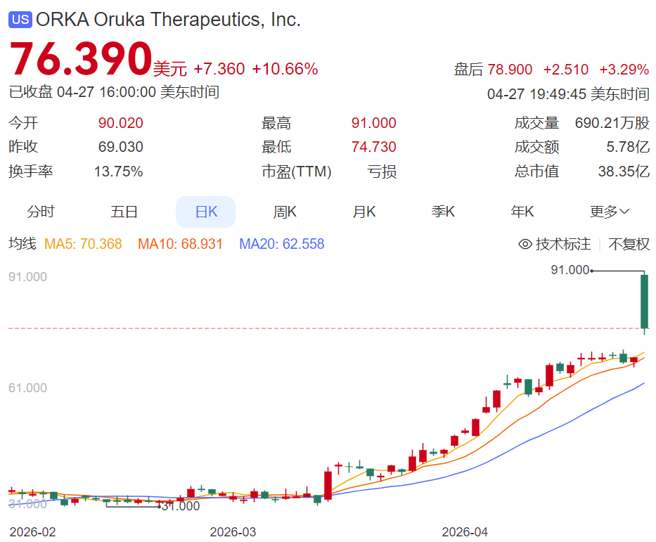 Oruka Therapeutics当天股价涨11%,目前市值为38亿美元。