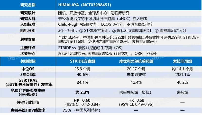 该逻辑的验证来自全球III期临床研究HIMALAYA,中国队列中位OS达25.3个月,3年OS率40.6%;且STRIDE方案的3/4级治疗相关不良事件发生率仅24.1%,远低于“O+Y”的历史数据,免疫介导的肝炎发生率仅2.3%。对中国75%伴有乙肝感染的肝癌患者来说,“肝友好”的安全性特征,是监管机构敢于放行的关键。