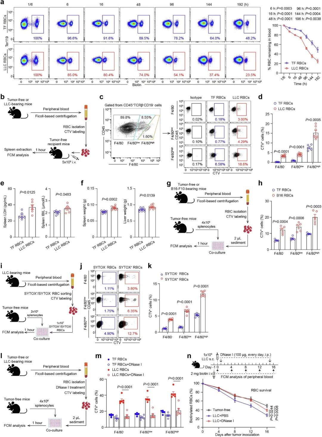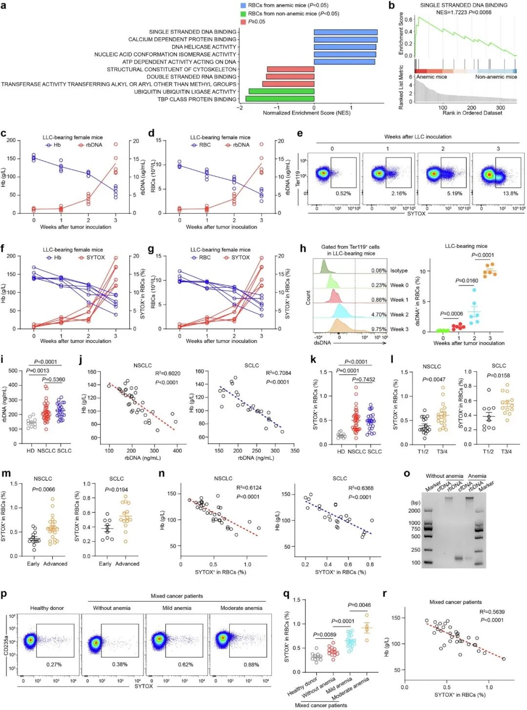 研究人员在小鼠肿瘤模型和癌症患者的血液中均观察到,随着肿瘤进展和贫血加重,红细胞表面结合的DNA(rbDNA)水平显著升高,且与血红蛋白浓度呈强负相关。这表明,rbDNA并非简单的“旁观者”生物标志物,而可能是致病因子。