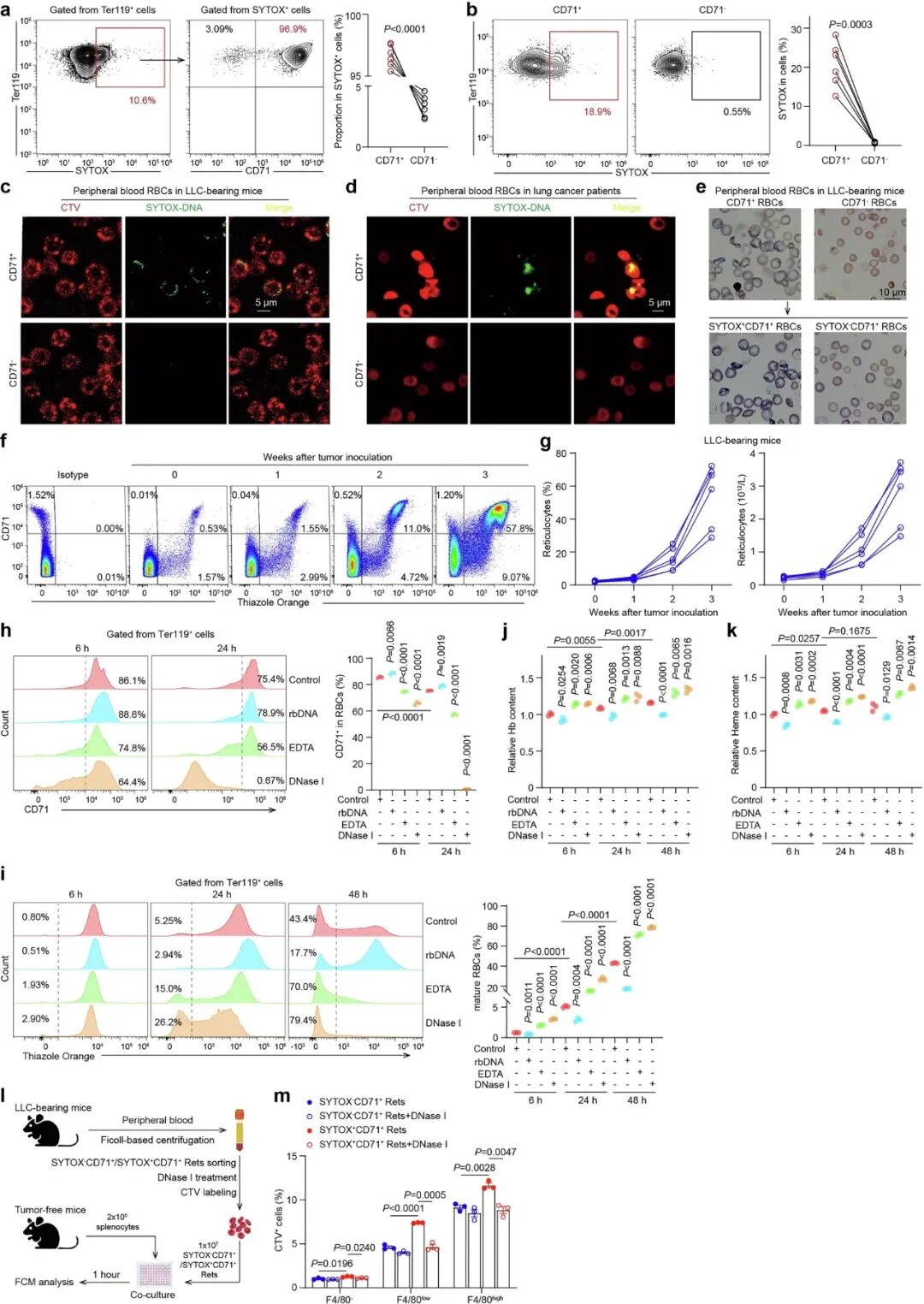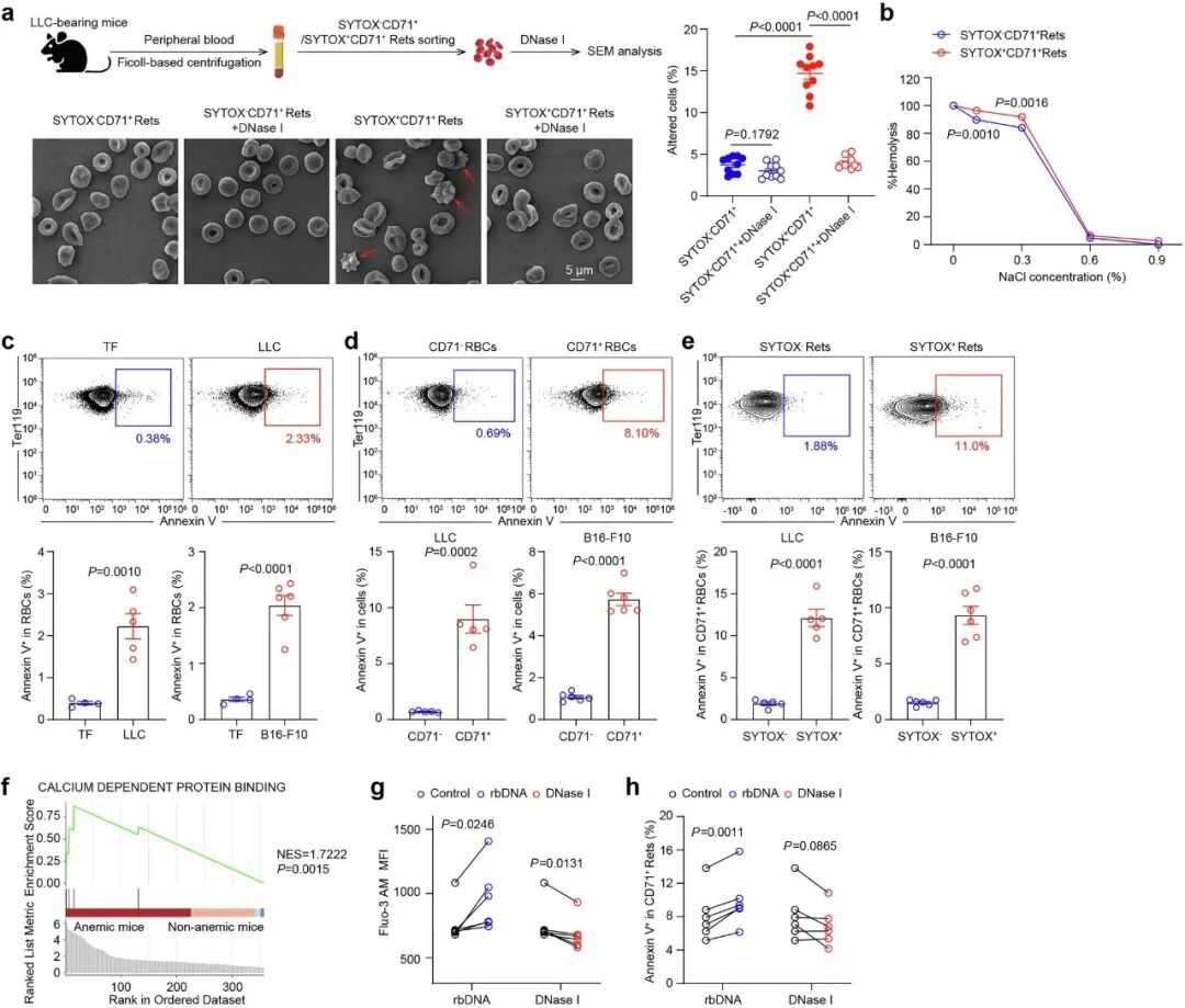 基于这一全新机制,研究团队测试了针对性治疗策略。既然肿瘤DNA是触发器,那么清除它就能阻断后续的破坏链。实验表明,给荷瘤小鼠注射DNase I后,红细胞表面的DNA被有效清除,网织红细胞的形态异常和凋亡标志显著减少,被吞噬的速度也大幅下降。最终,小鼠的贫血状况得到了显著改善,且不影响肿瘤本身的生长。