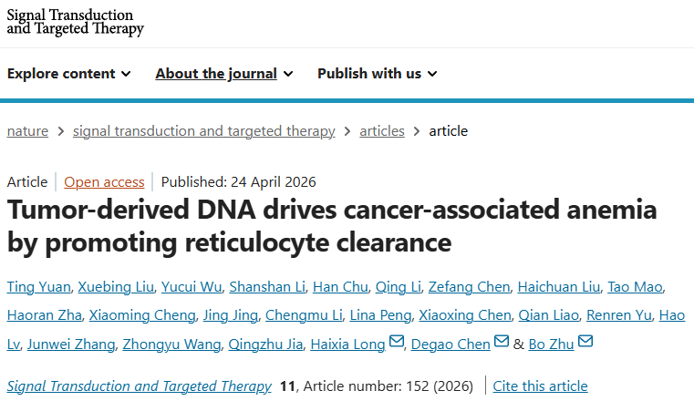 近日,陆军军医大学第二附属医院(重庆新桥医院)朱波/陈德高/龙海霞团队在国际知名期刊《Signal Transduction and Targeted Therapy》发表一项重磅研究,为这一临床难题带来了突破性见解。研究团队发现,肿瘤释放到血液中的循环DNA(cfDNA)能够直接“攻击”未成熟的红细胞,是驱动癌症相关贫血的关键“元凶”。更重要的是,研究提出了一种创新的联合疗法——使用DNA酶I(DNase I)降解这些有害DNA,并与促红细胞生成素(EPO)联用,在临床前模型中有效逆转了贫血,为未来临床转化提供了全新策略。