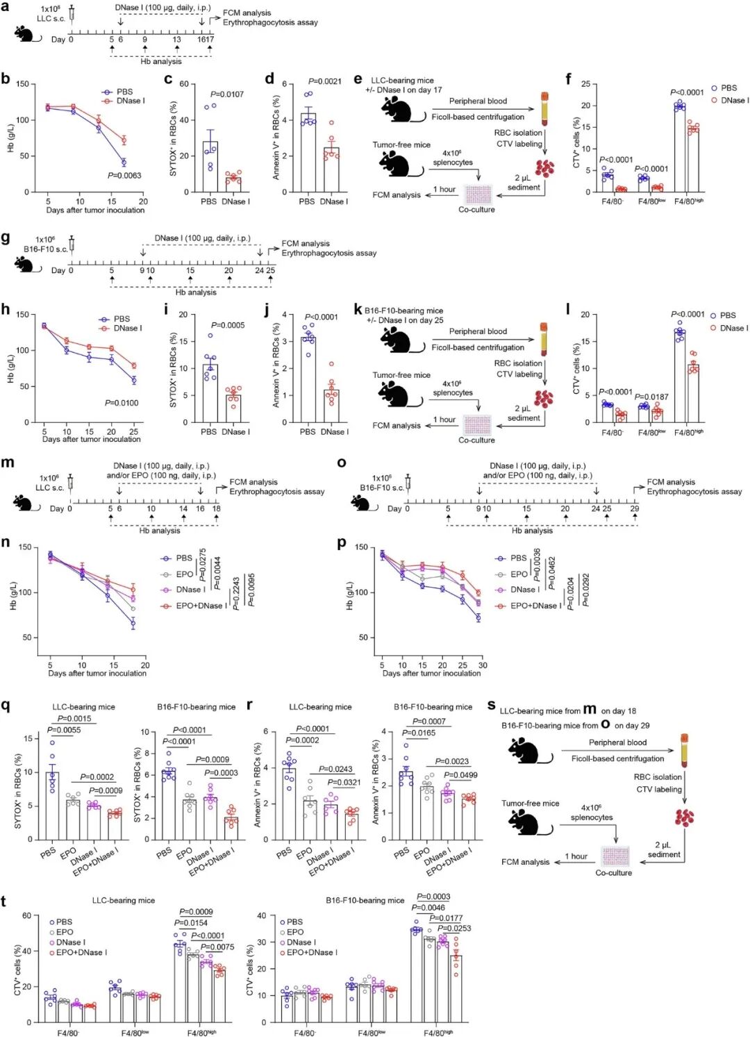 为此,研究团队创新性地将两种策略结合。在肺癌和黑色素瘤小鼠模型中,“DNase I + EPO”的联合治疗展现了卓越的协同效果。与单一疗法相比,联合治疗能更显著地提升血红蛋白水平和红细胞计数,更有效地减少红细胞表面的DNA结合和凋亡,并进一步抑制吞噬性清除。