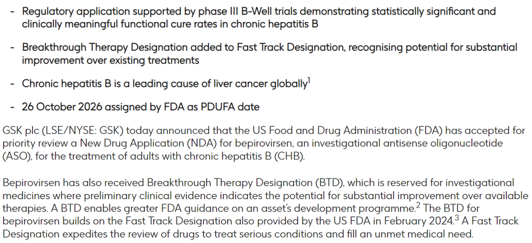2026年4月28日,葛兰素史克宣布其乙肝ASO新药Bepirovirsen的上市申请获得FDA受理,并获得优先审评资格,同时也获得突破疗法认证(BTD),PDUFA日期为2026年10月26日。