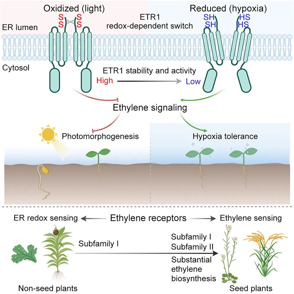 在这项最新研究中,研究团队发现,乙烯受体通过定位在内质网腔内的分子间二硫键感知内质网的氧化还原状态。内质网发生还原应激(而非乙烯本身)会破坏受体间由二硫键连接的二聚体,抑制其功能,从而激活下游乙烯信号通路。此外,通过调控受体 ETR1(ETHYLENE RESPONSE 1)中二硫键的形成以响应内质网氧化还原状态的变化,有助于植物在低氧条件和光形态建成过程中的适应能力。