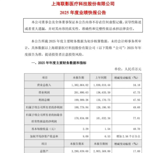 2025年,联影医疗实现营业收入138亿元,同比增长33.98%;实现归母净利润18.69亿元,同比增长48.14%;扣非归母净利润17.70亿元,同比大增75.18%。公司表示,业绩增长主要受益于国内大规模医疗设备更新政策常态化实施,行业整体规模回升,医学影像设备销售量同比增长超35%。