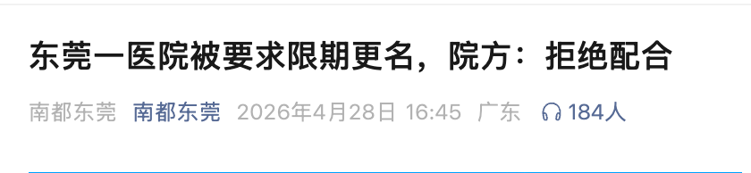 院方认为,医院“合理合规持有该品牌”,希望主管部门撤回限期整改通知书。医院现阶段的核心诉求是保住现有机构登记名称,维护品牌连续性,持续为患者提供优质服务。据了解,此前东莞一直未有公立口腔医院。这家民营“东莞口腔医院”成立于2016年12月,是一所集口腔疾病诊疗、预防、保健、科研于一体的口腔专科医院,占地20余亩,一期投入使用建筑面积达1万余平方米,多年来深耕东莞口腔医疗市场。今年3月5日,在2026年东莞市卫生健康工作会议上,官方明确提出推动莞城医院和暨南大学附属第一医院合作共建“东莞口腔医院”,补齐本地公立口腔医疗资源短板。此前,民营东莞口腔医院名称权属就曾引发过当地讨论。2025年东莞两会期间,东莞市政协委员、民盟东莞市委委员涂华建议,东莞市市场监督管理局应联合东莞市卫健局根据相关法律法规,督促民营的“东莞口腔医院”进行名称变更,防止名称混淆,以免误导患者,为“东莞市口腔医院”的命名打好基础。事实上,医疗机构名称之争在业内并不鲜见,背后往往牵涉品牌资产、患者认知与行政规范的多重博弈。为规范医疗机构名称使用,近年来国家多部门持续出台监管文件,明确命名边界与管理红线。2017年修订的《医疗机构管理条例实施细则》明确要求,各级地方人民政府设置的公立医疗机构,识别名称中应当含有省、市、区等行政区划名称,其他医疗机构的识别名称中不得含有行政区划名称。2020年,国家卫健委、民政部、市场监管总局等四部门发布《关于进一步规范医疗机构名称管理工作的通知》,严禁医疗机构刻意使用近似名称、仿冒名称、谐音名称,禁止刻意蹭公立医疗标识、制造身份混淆,严格限制同名、近名机构审批。随着监管趋严,一些民营医疗机构如何在合规框架下保护既有品牌,仍将是行业面临的共性难题。原报道链接:东莞一医院被要求限期更名,院方:拒绝配合(采写:南都N视频 记者 黄芳芳)