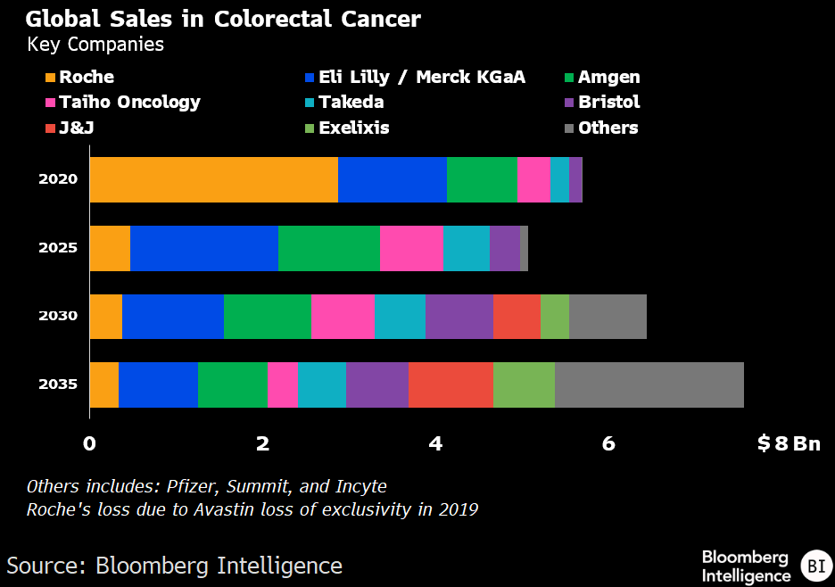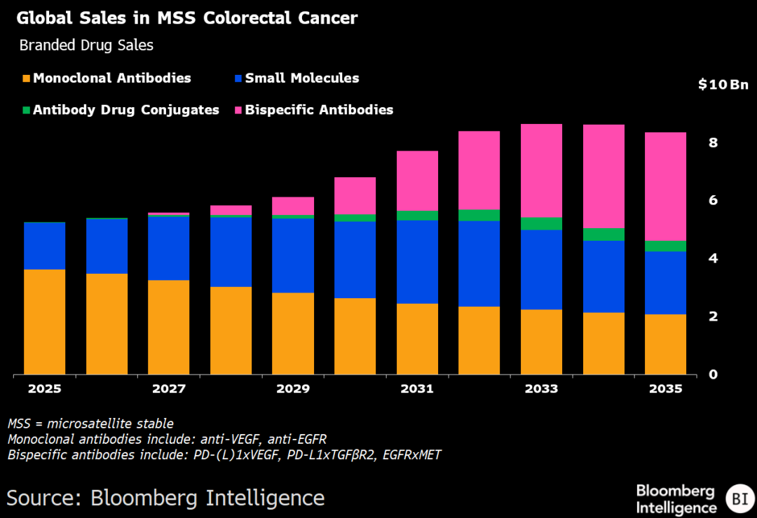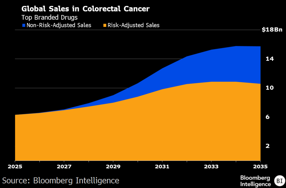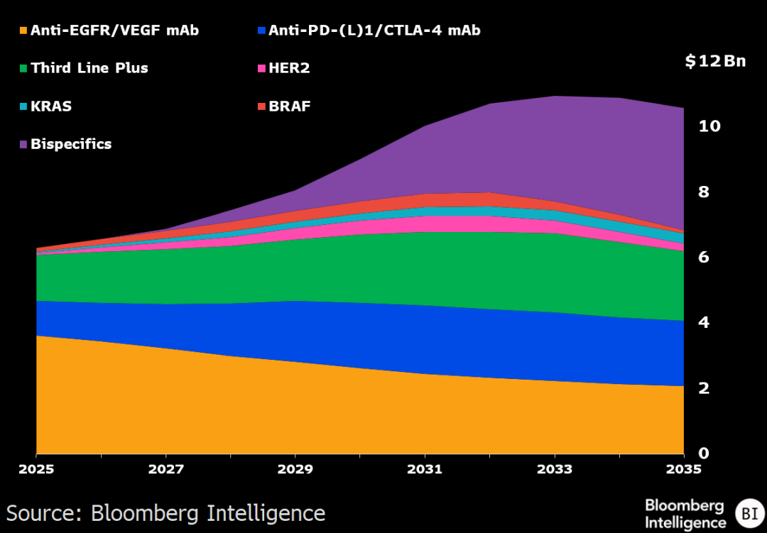 (彭博行业研究)——强生和Summit/康方生物旗下的新型双特异性抗体药物,正推动由抗血管生成疗法主导数十年的结直肠癌(CRC)标准治疗方案发生变革。彭博行业研究(BI)的情景分析显示,到2035年,该市场的销售额有望突破105亿美元,在去风险假设下,规模甚至可能接近160亿美元。Incyte、百时美施贵宝/BioNTech和辉瑞/三生制药正竞相争夺这一新兴市场的份额,而Exelixis的首款CRC后线药物若能成功上市,也可能带来丰厚回报,但差异化竞争将是关键。