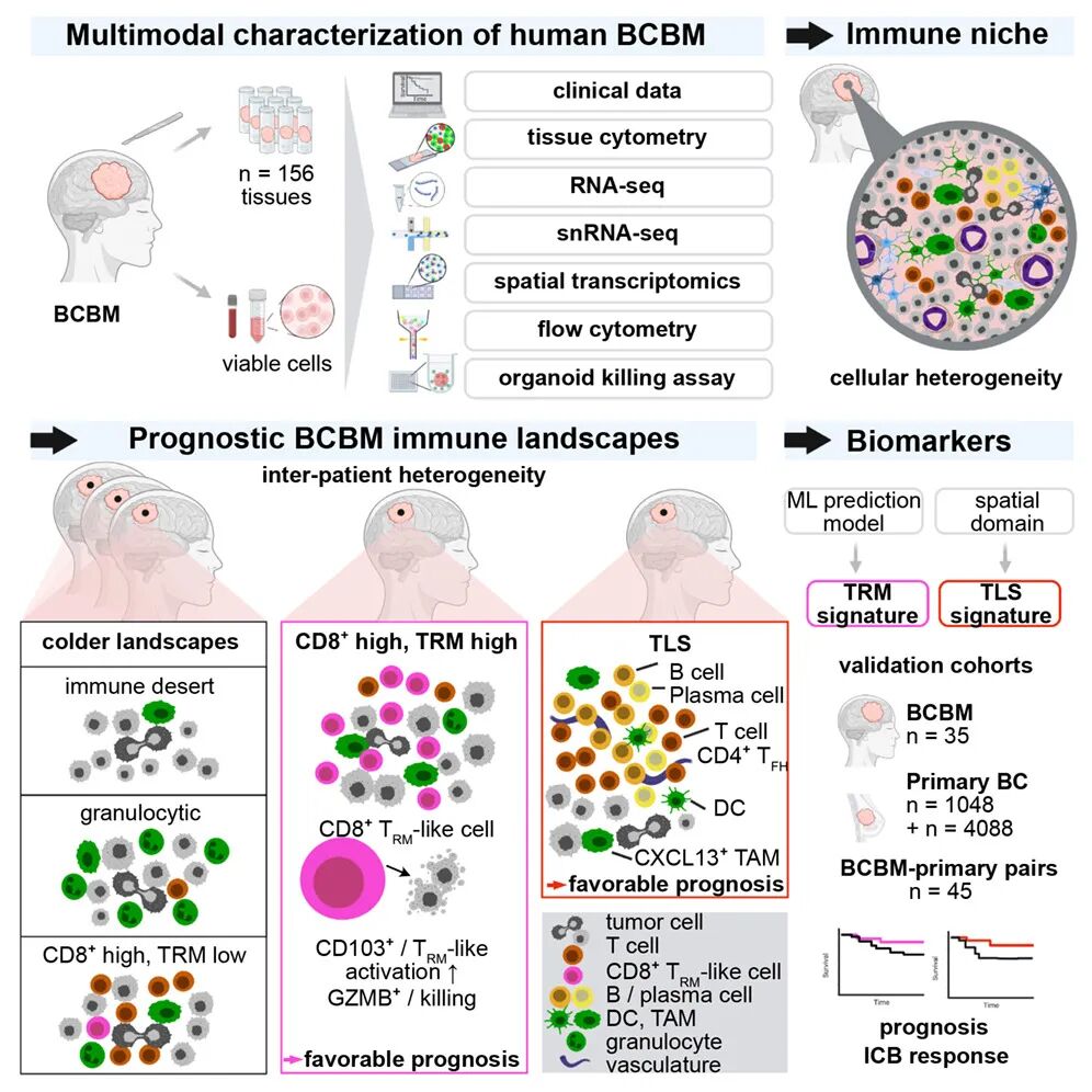 近日,一项针对乳腺癌脑转移(Breast Cancer Brain Metastases, BCBM)免疫微环境的大规模多组学研究成果在国际知名期刊《Cancer Cell》发表。研究团队通过对156例BCBM样本进行深度分析,首次系统性描绘了其复杂的免疫细胞图谱,并鉴定出两种能够独立预测患者长期生存的、独特的免疫微环境特征。这一发现为开发针对这一致命并发症的精准免疫治疗策略提供了关键的科学依据和新型生物标志物。