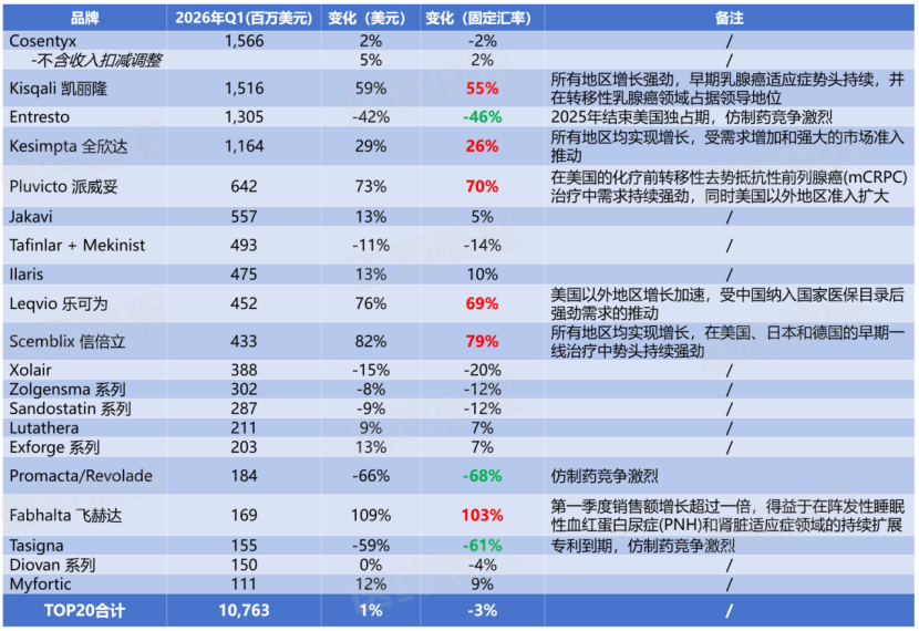 诺华一季度TOP20产品销售额