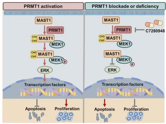 体外和体内实验表明,C7280948处理能有效抑制CLL的肿瘤生长。定量蛋白质组学和免疫共沉淀分析揭示了PRMT1与MAST1之间存在相互作用,该作用被证实可促进CLL进展。抑制PRMT1可降低MAST1在R806位点的非对称性二甲基精氨酸修饰,并通过影响CLL细胞中MEK1和ERK1/2的磷酸化,下调MAPK通路的激活。
