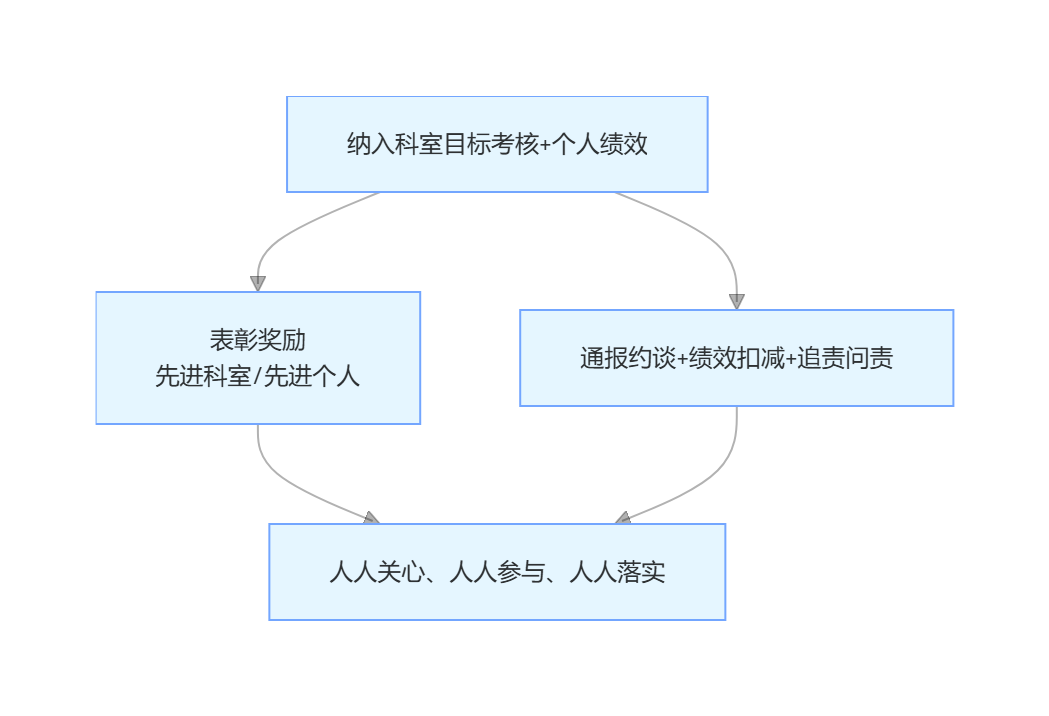 迎检工作覆盖全院、涉及全员,必须依靠强有力的责任落实与督导考核保障落地。医院应将等级评审任务纳入科室年度目标考核与个人绩效评价体系,明确奖惩措施,对工作推进迅速、整改成效突出的科室和个人予以表彰激励;对敷衍塞责、拖延整改、影响整体进度的予以通报约谈、追责问责。