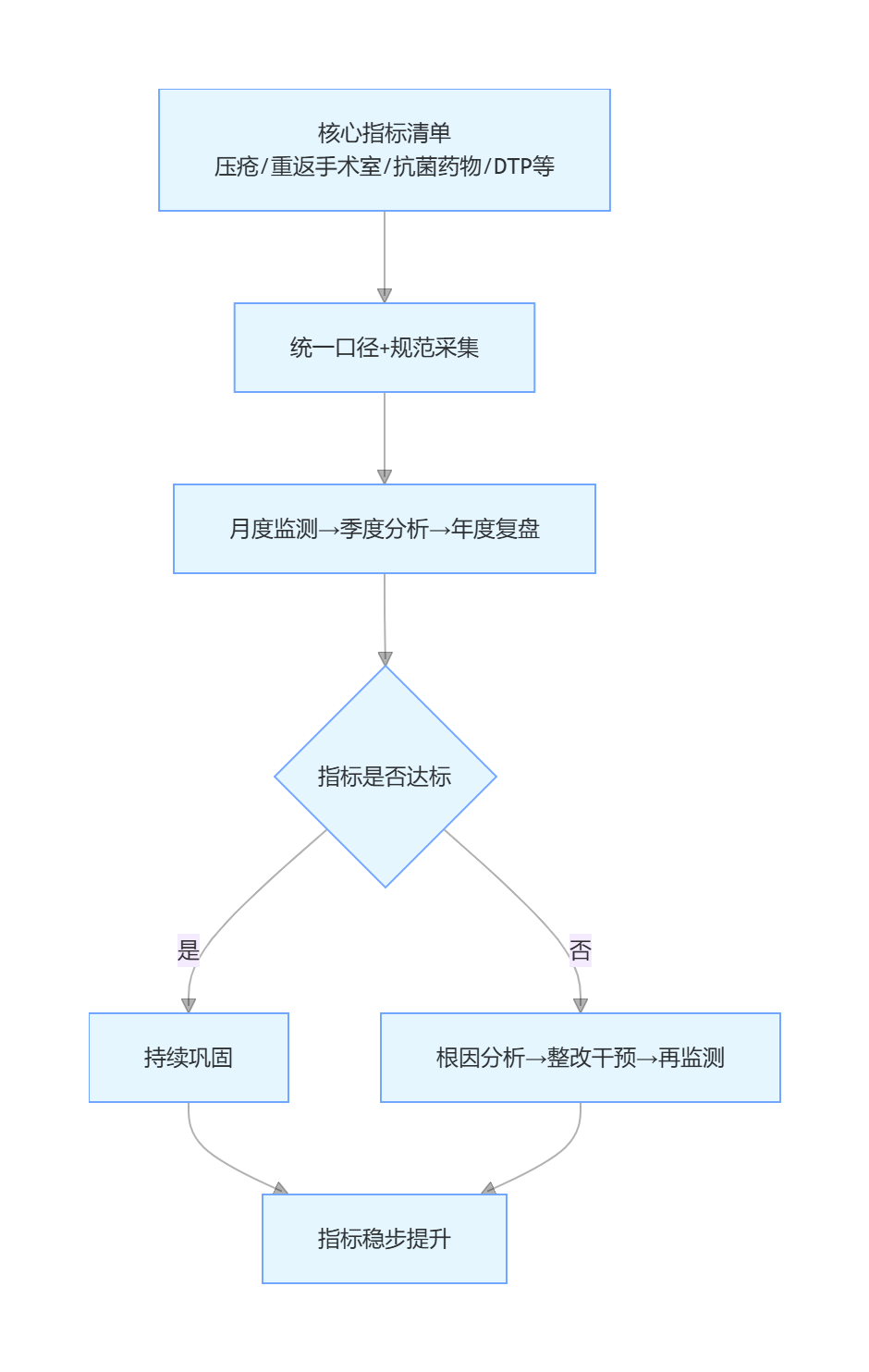 针对住院患者压疮发生率、非计划重返手术室发生率、抗菌药物使用强度、急性心梗/卒中救治时间等核心指标,医院应统一统计口径、规范采集流程、强化源头质控,杜绝数据多头填报、前后矛盾、逻辑不符等问题。建立指标月度监测、季度分析、年度复盘机制,对波动较大、持续不达标的指标及时预警,深入分析流程、技术、管理、人员等层面原因,制定针对性改进措施。通过常态化质控与专项整治相结合,推动核心指标稳步提升,既满足评审要求,也真正提升医疗安全保障能力。