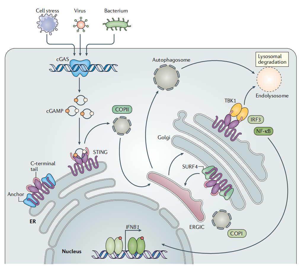 位于内质网(ER)膜上的同型二聚体蛋白STING可识别并结合cGAMP,结合后STING发生构象改变,进而触发其寡聚化。随后,STING通过内质网-高尔基体中间隔室(ERGIC)转运至高尔基体。到达高尔基体后,STING在两个半胱氨酸残基(Cys88和Cys91)处发生棕榈酰化修饰。其C末端招募TANK结合激酶1(TBK1)并与之相互作用,TBK1随后磷酸化STING蛋白C末端的Ser366残基,并进一步磷酸化干扰素调控因子3(IRF3)。磷酸化的IRF3形成二聚体,发生核移位,诱导靶基因的表达。此外,STING还可激活核因子κB(NF-κB),后者亦能上调I型干扰素(IFN)的表达水平。