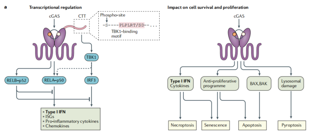 在整个进化历程中,cGAS-STING通路的激活主要发挥抗病毒感染的作用,并与抗病毒细胞程序密切相关。