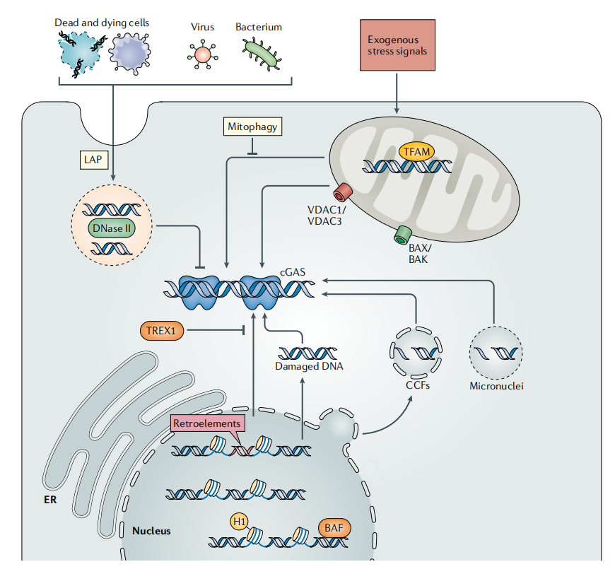 在细胞及生物体层面,对DNA丰度、区室化隔离及清除过程的精细调控本身具有高度复杂性,因此易受多种因素干扰而失衡。尽管不同病理过程的触发因素具有疾病特异性,但已有证据表明,cGAS-STING通路作为驱动因素,在与多种疾病相关的急性和慢性、低级别炎症状态中表现出相当程度的一致性。