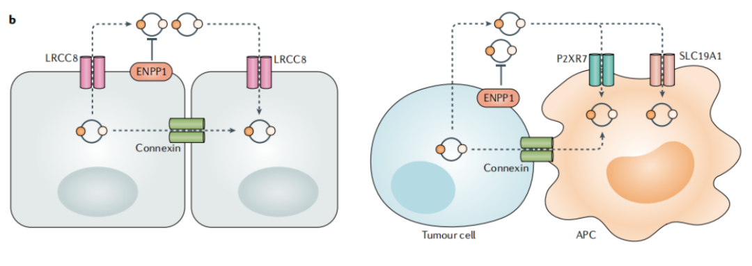 在细胞外空间中,cGAMP可被外核苷酸焦磷酸酶/磷酸二酯酶家族成员1(ENPP1)降解。与此同时,多种细胞类型利用由LRRC8亚基组成的电压依赖性阴离子通道(VDAC)实现cGAMP的导入与导出。研究还表明,肿瘤细胞能够输出cGAMP,而骨髓细胞则通过SLC19A1或P2XR7通道摄取cGAMP。