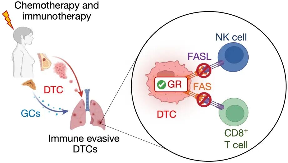 GR激活是DTCs抵抗细胞毒性淋巴细胞杀伤的关键机制,药物抑制GR联合免疫治疗可特异针对DTCs,预防转移复发。