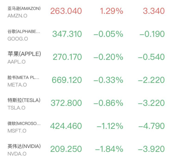 明星科技股普跌,微软、英伟达跌超1%,仅亚马逊收盘涨1.29%。