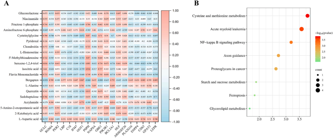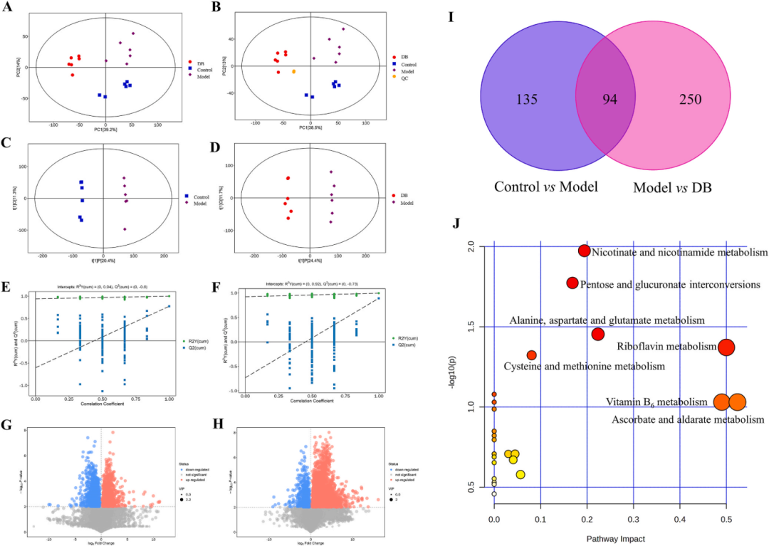 肝脏样本的主成分分析(PCA)模型结果显示对照组、模型组和DB组之间存在明确的组间关联,并观察到显著的组别代谢物聚类趋势(图8A)。采用正交偏最小二乘判别分析(OPLS-DA)方法检测对照组与模型组、模型组与DB组之间的整体代谢差异,以识别潜在差异代谢物,两组间呈现明显的聚类分离(图8C-D)。以VIP>1.0且P<0.05为差异代谢物的筛选标准,最终确定94种差异代谢物作为潜在生物标志物,与模型组相比,DB组中59种代谢物表达上调,35种表达下调(图8I)。将差异代谢物导入MetaboAnalyst 5.0进行代谢通路分析,Impact≥0.1的潜在相关通路包括:烟酸和烟酰胺代谢、戊糖与葡萄糖醛酸转化、丙氨酸-天冬氨酸-谷氨酸代谢以及核黄素代谢(图8J)。