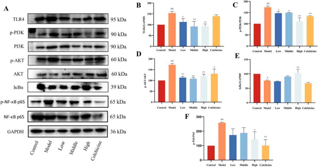 通过检测TLR4、PI3K、p-PI3K、AKT、p-AKT、IκBα、NF-κB p65及p-NF-κB p65蛋白的表达水平,揭示了DB抗CCl₄诱导大鼠肝纤维化的潜在作用机制。结果显示,与对照组相比,模型组中TLR4、PI3K、p-PI3K、AKT、p-AKT、IκBα、NF-κB p65和p-NF-κB p65蛋白表达均显著升高(图11A)。对各条带进行灰度定量分析,与模型组相比,DB治疗组TLR4、p-PI3K、p-AKT、NF-κB p65和p-NF-κB p65的表达水平显著降低,而IκBα的表达明显回升(图11B-F)。