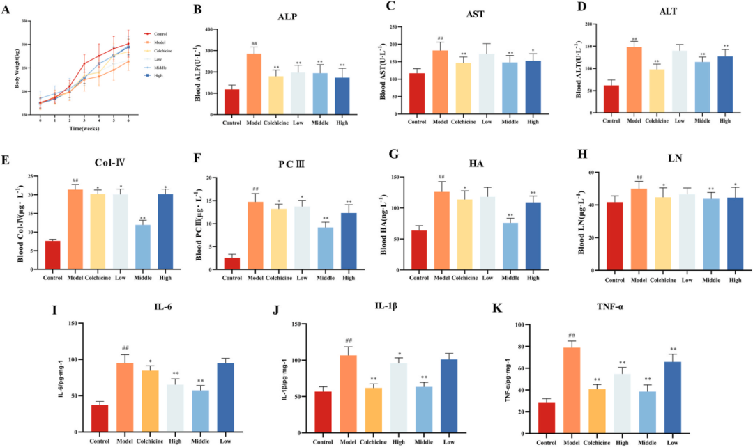 肝脏功能及炎症相关指标的检测结果显示(图2),与对照组相比,CCl₄模型组大鼠血清ALP、AST、ALT、Col-IV、PCIII、HA、LN及肝脏IL-6、IL-1β、TNF-α水平均显著升高;而经过秋水仙碱和不同剂量DB治疗后,上述指标明显下降。同时,实验期间,对照组大鼠体重显著增加,而模型组体重增长缓慢,经药物干预后体重下降趋势得到改善。