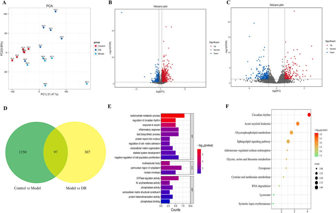 研究进一步利用转录组测序探讨DB改善HF的分子机制。PCA得分图(图7A)显示,造模6周后CCl₄诱导HF大鼠的肝转录组谱与对照组有显著分离;而经DB治疗的肝纤维化模型大鼠转录组样本独立聚为一类,与模型组明显分离,且位于对照组与模型组之间并更接近对照组样本。这表明为期四周的DB水提物治疗能影响肝纤维化模型大鼠的肝脏基因表达。通过设定筛选条件,共鉴定出以下差异表达基因(DEGs):对照组与模型组比较存在1347个DEGs,其中1039个基因表达上调,308个基因表达下调(图7B);模型组与DB治疗组比较存在404个DEGs,其中181个基因表达上调,223个基因表达下调(图7C)。维恩图显示各组间存在97个共同DEGs,其中91个基因在组间呈现差异表达,这些可能是DB治疗肝纤维化的关键DEGs(图7D)。进一步对上述DEGs进行GO富集分析(图7E)和KEGG通路富集分析(图7F)发现:GO富集分析表明DB能广泛影响碳水化合物代谢、昼夜节律调节、胰岛素反应、炎症反应及脂质生物合成等生物学过程,这些多元生物过程共同促进对肝纤维化大鼠的治疗作用;KEGG通路分析则显示DB治疗主要影响甘油磷脂代谢、鞘脂信号传导、铁死亡等相关通路。这些发现提示,DB通过改变基因表达并映射至相关信号通路,从而有效调控肝纤维化大鼠的肝脏转录过程。