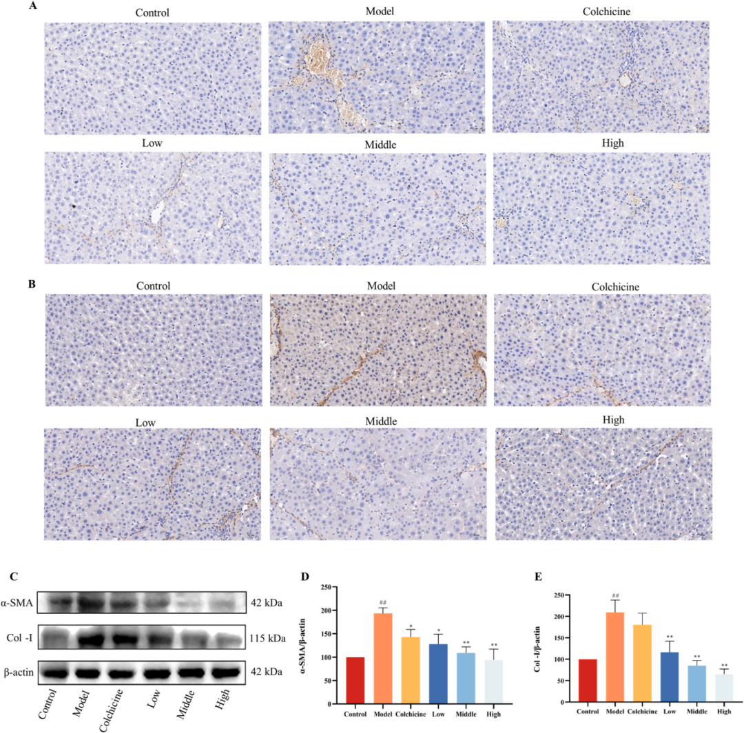 肝星状细胞活化是HF的关键环节。α-SMA是HSCs活化的标志物,而Col-I是HSCs激活后释放的主要细胞外基质。通过免疫组化和Western blot技术检测α-SMA与Col-I的表达水平,可在一定程度上反映肝纤维化的严重程度。在CCl4诱导的肝纤维化大鼠肝组织中,α-SMA与Col-I的表达均显著升高,而经过DB干预后,这两种蛋白的表达均被显著抑制(图4)。