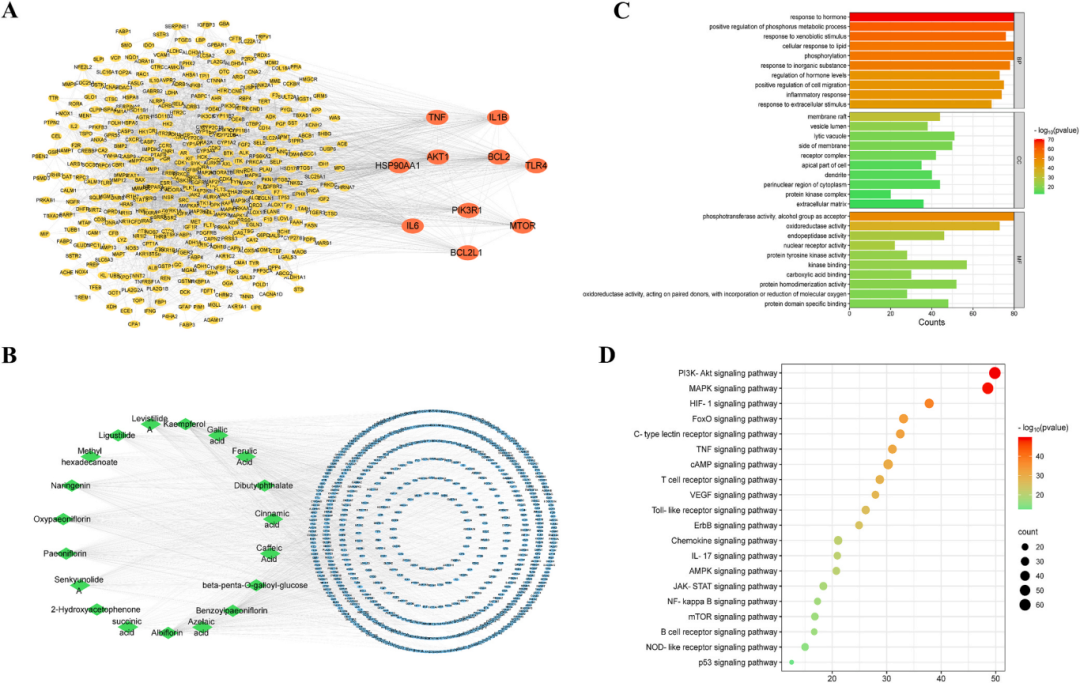 将DB活性成分对应的608个靶点与6711个HF相关靶点进行比对,发现453个交集靶点,并据此构建PPI网络(图6A)。拓扑分析显示,连接度排名前十的关键靶点依次为AKT1、IL6、HSP90AA1、TNF、BCL2、IL1β、TLR4、PIK3R1、BCL2L1和MTOR,这些靶点可能介导DB抗HF作用。利用Cytoscape 3.2.1构建成分-靶点网络(图6B)。对354个潜在核心靶点进行GO富集分析发现,生物学过程主要涉及激素反应、磷酸化代谢正调控和外源刺激反应(图6C)。KEGG信号通路分析显示,PI3K-Akt、MAPK和VEGF等信号通路位列前20条关键通路(图6D)。