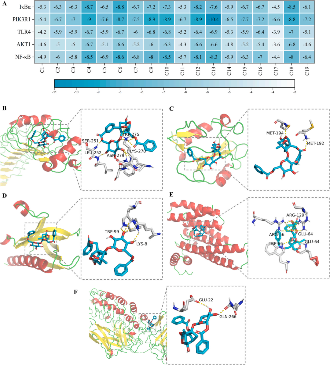 以苯甲酰芍药苷与五个核心靶点的对接为例,其可视化结果如图10B-F所示。图中显示,苯甲酰芍药苷与NF-κB靶点的GLU:22和GLN:266形成氢键作用,与AKT1靶点的TRP:99和LYS:8产生氢键结合,与TLR4靶点的SER:251、LEU:252、ASN:279、LYS:279、TRP:275形成氢键网络,与PIK3R1靶点的MET:194、MET:192建立氢键连接,并与IκBα靶点的ARG:129、ARG:56、TRP:66、GLU:64形成多重氢键作用,表明该化合物能与核心靶点形成稳定复合物。