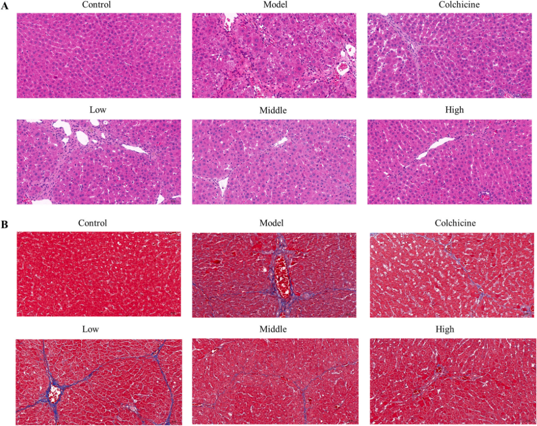 为评估DB对CCl₄诱导大鼠肝损伤的保护作用,采用HE和Masson染色观察肝组织病理变化(图3)。HE染色显示,对照组肝小叶结构完整,肝细胞形态规则、排列整齐,肝窦无扩张,无炎症改变;CCl₄组则见肝小叶结构破坏,中央静脉周围纤维间隔增生,形成大小不一的假小叶,伴淋巴细胞浸润及肝细胞弥漫性水样变性。DB干预后上述病变明显减轻,提示其可缓解CCl₄所致肝损伤。Masson染色进一步显示,模型组胶原纤维显著增多,而秋水仙碱和DB给药组胶原沉积明显减少。综合生化与组织学结果,证实DB能有效阻止CCl₄诱导的肝功能异常及病理结构改变,发挥抗肝纤维化作用。
