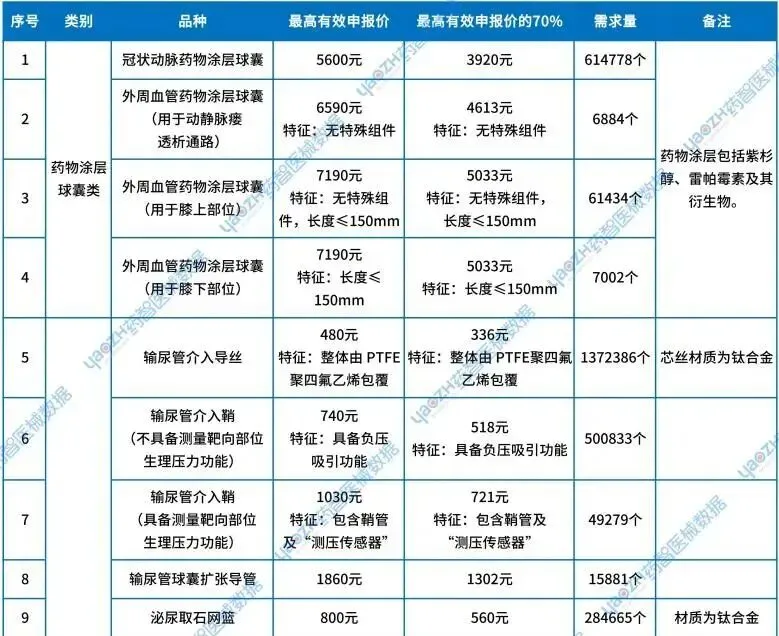 据正式采购文件,第六批国采覆盖药物涂层球囊、泌尿介入2大类12种医用耗材,涉及血管狭窄、泌尿系统结石手术等关键治疗领域,多类耗材需求量庞大,具体如下。