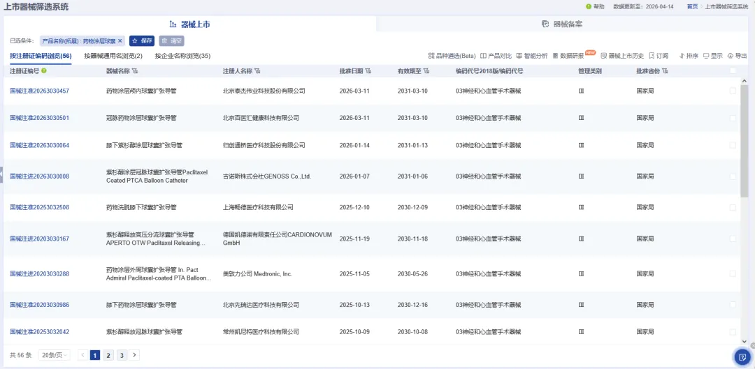 据药智医械数据查询,药物涂层球囊类产品的国产数量持续上涨,在已上市的50余款药物涂层球囊类产品中,国产占比已超七成,并且在企业排行中,多家本土械企名列前茅。同时,技术方面,国产械企也在持续突破创新,展现出我国在高端器械领域内的研发实力。
