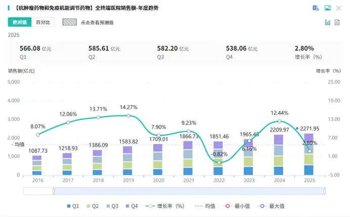 从市场层面来看,TF靶点的市场潜力虽被广泛看好,但需理性审视其实际空间。据摩熵医药数据显示,2024年我国抗肿瘤药物和免疫机能调节药物全终端医院销售额已达2209.97亿元,尽管2025年增速有所放缓(+2.80%),但庞大的存量市场为创新药提供了广阔空间,这也是TF靶点被称为“千亿赛道”的核心依据。但需要注意的是,目前TF靶向药物的临床渗透率仍处于较低水平,一方面,多数TF