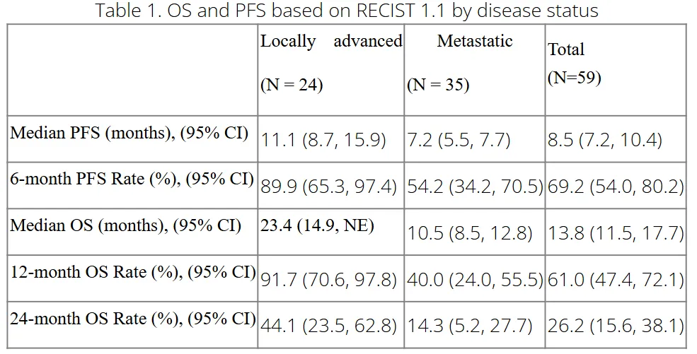 卡度尼利联合方案具有良好的肿瘤控制能力,56 例患者(95%)的患者完成了至少一次基线后肿瘤评估,ORR 为 33.9%,DCR 达 96.4%;局晚期与转移性患者的缓解率无显著差异,均能从卡度尼利联合方案中获益。