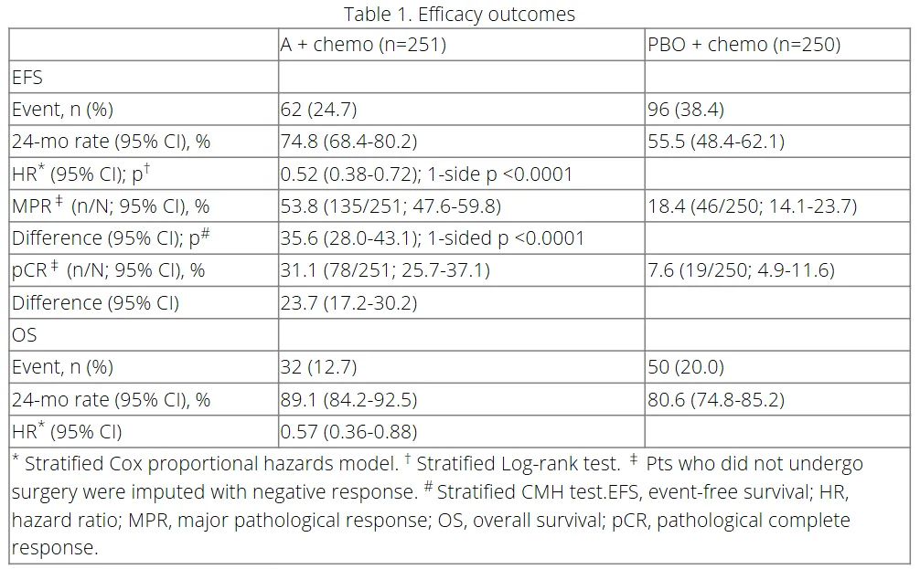 该研究共入组 501 例受试者,按照 1:1 随机入组,分别接受 3 个周期阿得贝利单抗或安慰剂联合铂类双药化疗(Q3W),随后进行手术,术后接受 16
